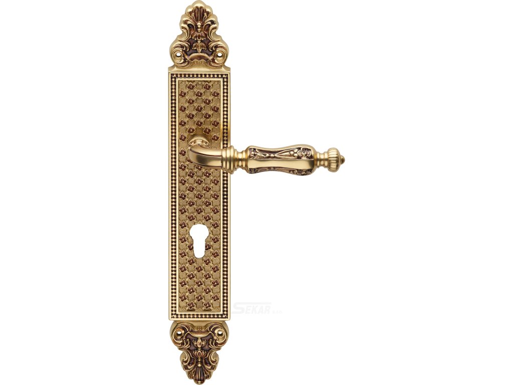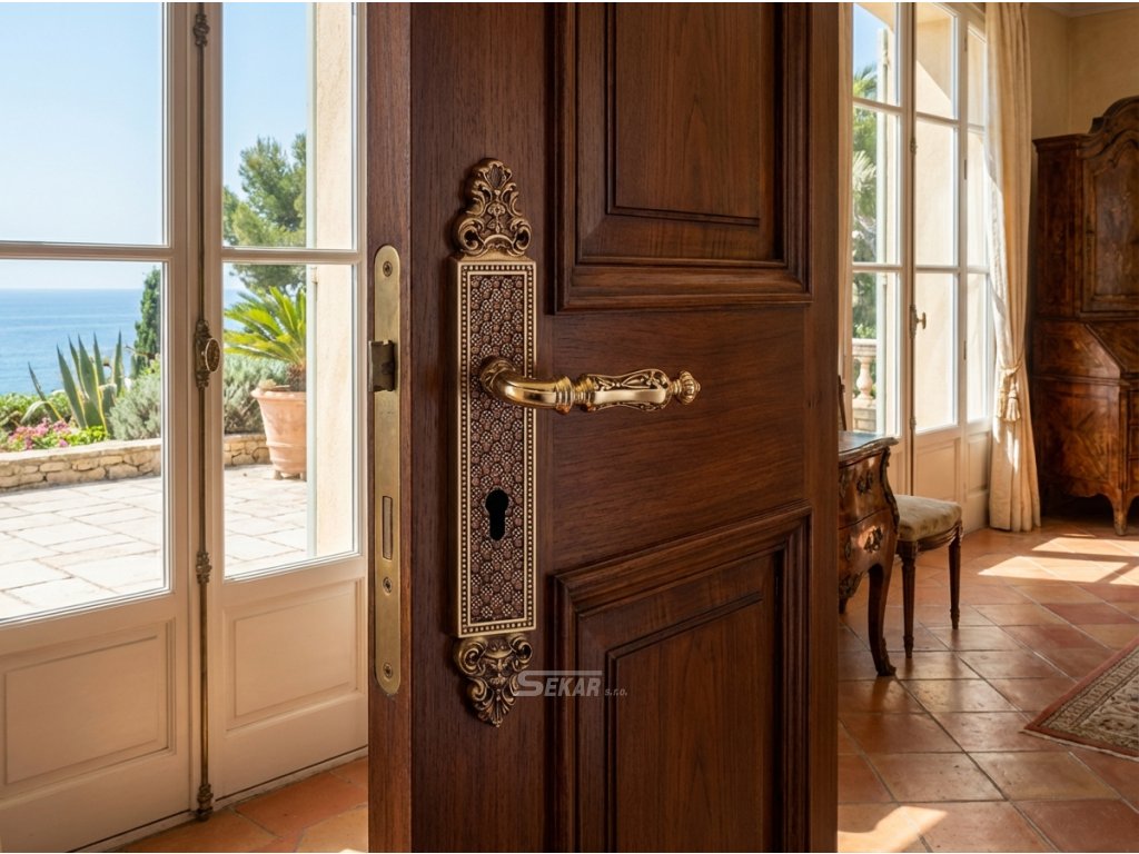 Sada mosazné kliky na dveře v různých povrchových úpravách a variantách zámků.