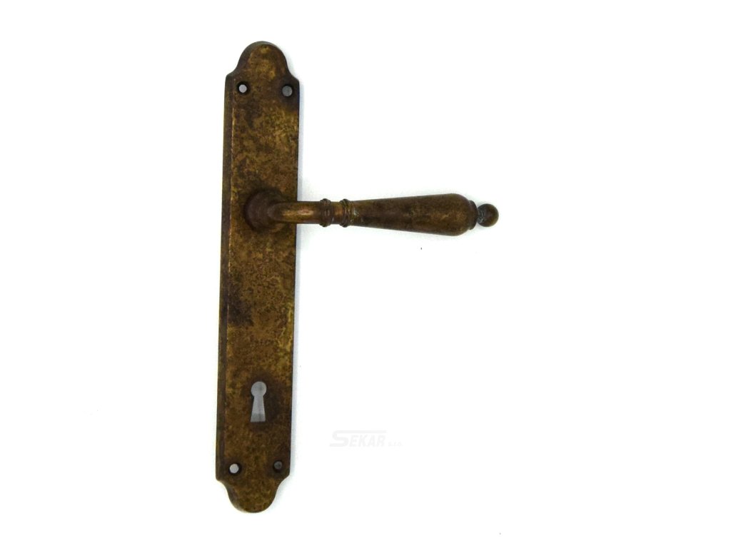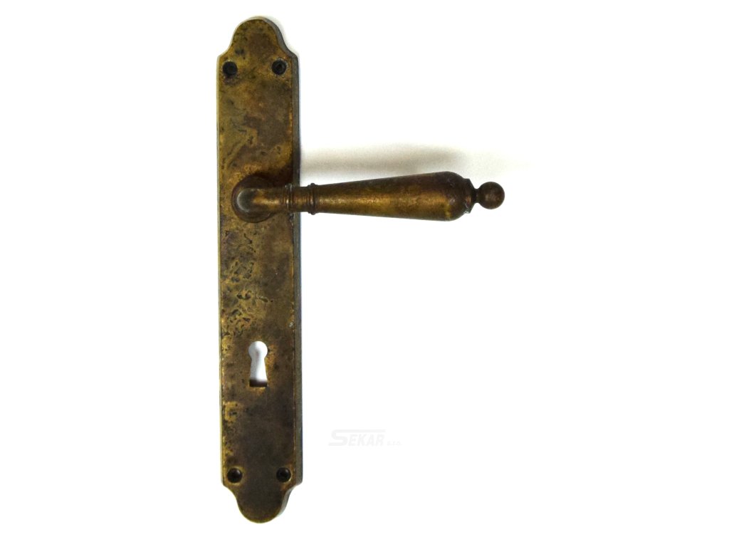 Mosazná stylová klika v galvanických povrchových úpravách Antik, Matný bronz, Staré železo a surová omletá mosaz vibráto VB.