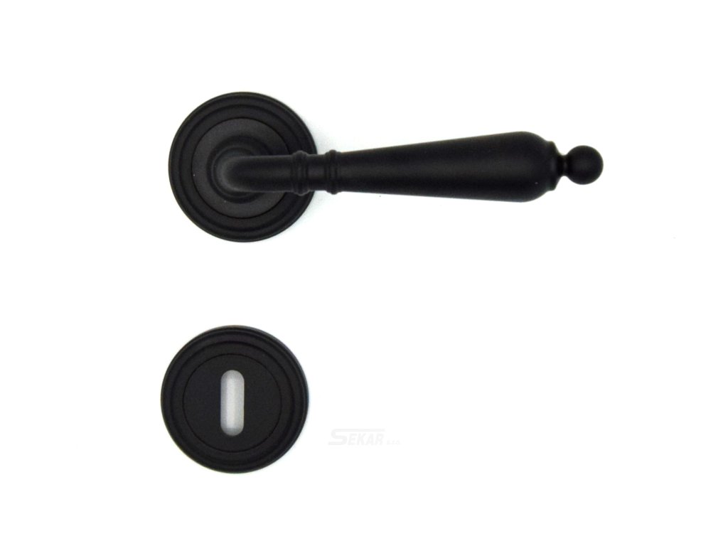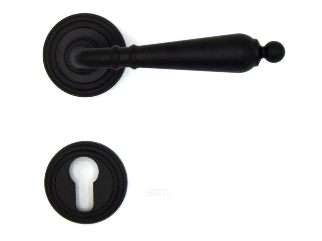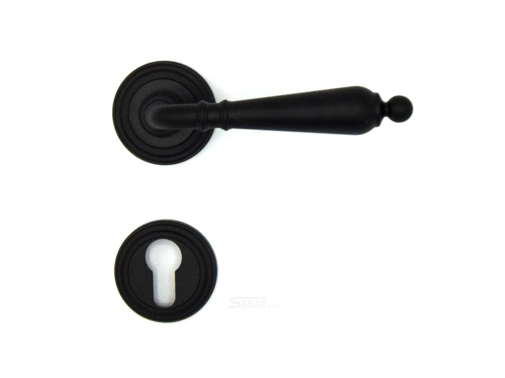 Mosazná stylová klika černá na šroubovacích rozetách se skrytými upevňovacími šroubky 011.