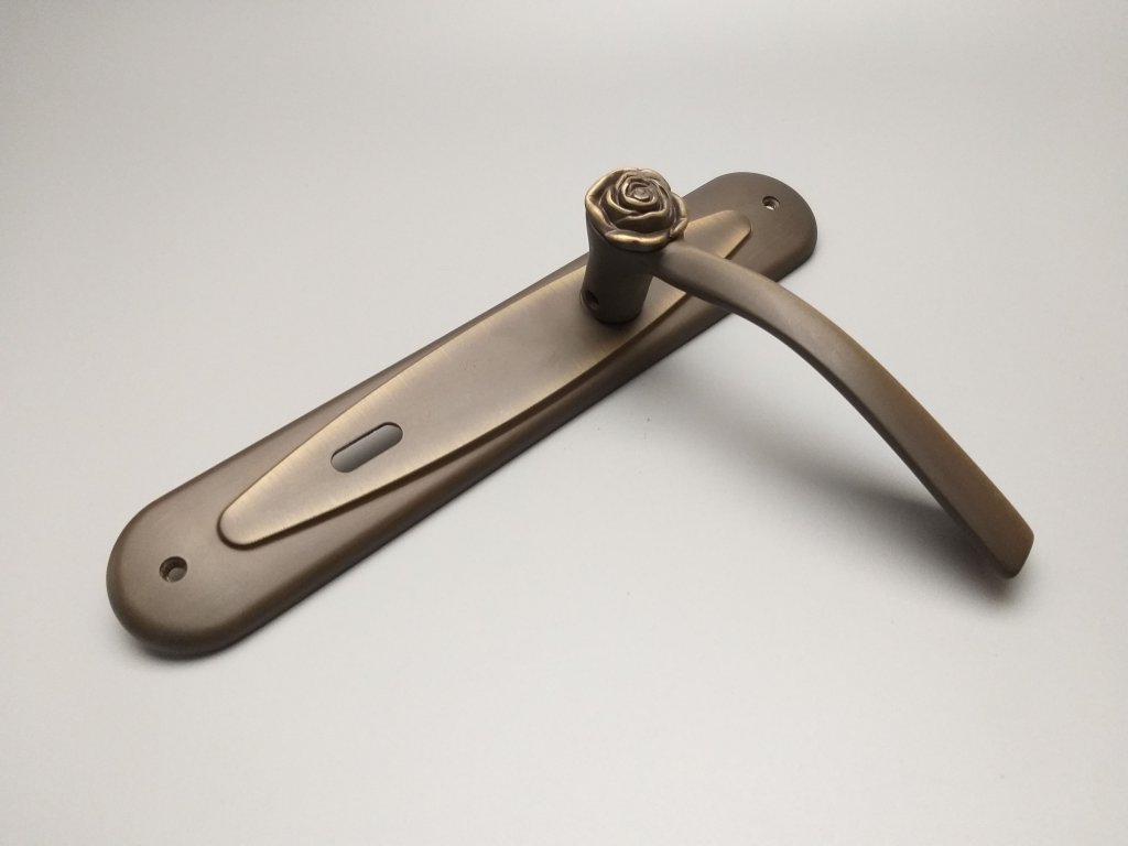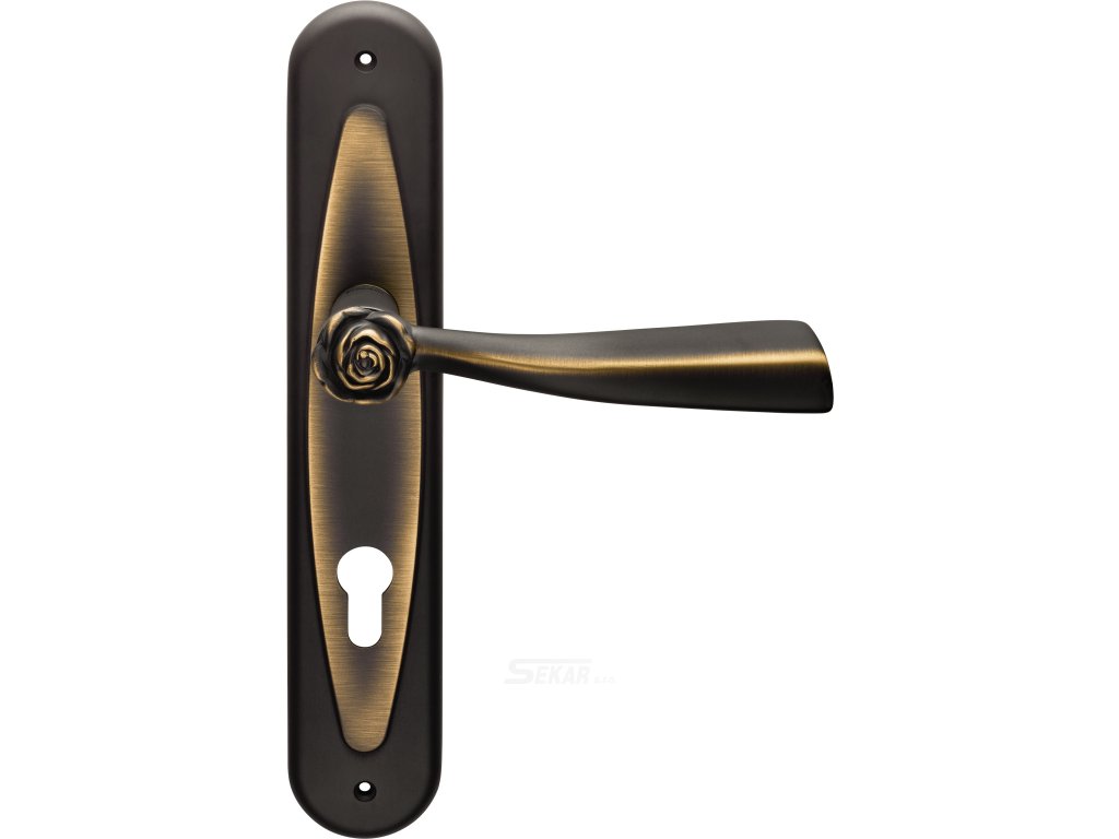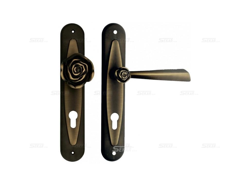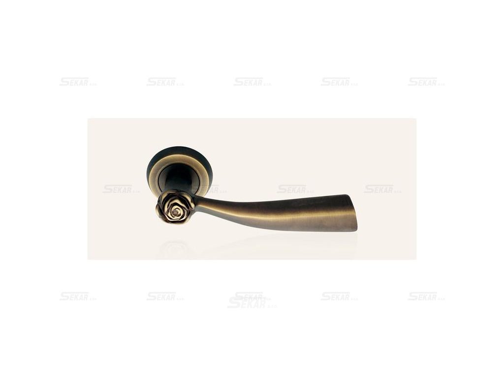 Mosazná stylová klika v galvanických povrchových úpravách Antik, Matný bronz a Staré železo. Cena kliky je vždy za sadu na dveře a součástí dodávky je i spjovací materiál, šrobky v barvě kliky a čtyřhran pro dveře síla 40mm.
