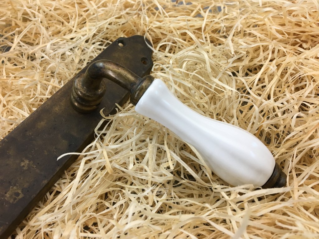 Dveřní madlo s vroubkovaným porcelánem, rozteč montážních šroubů je 218mm.