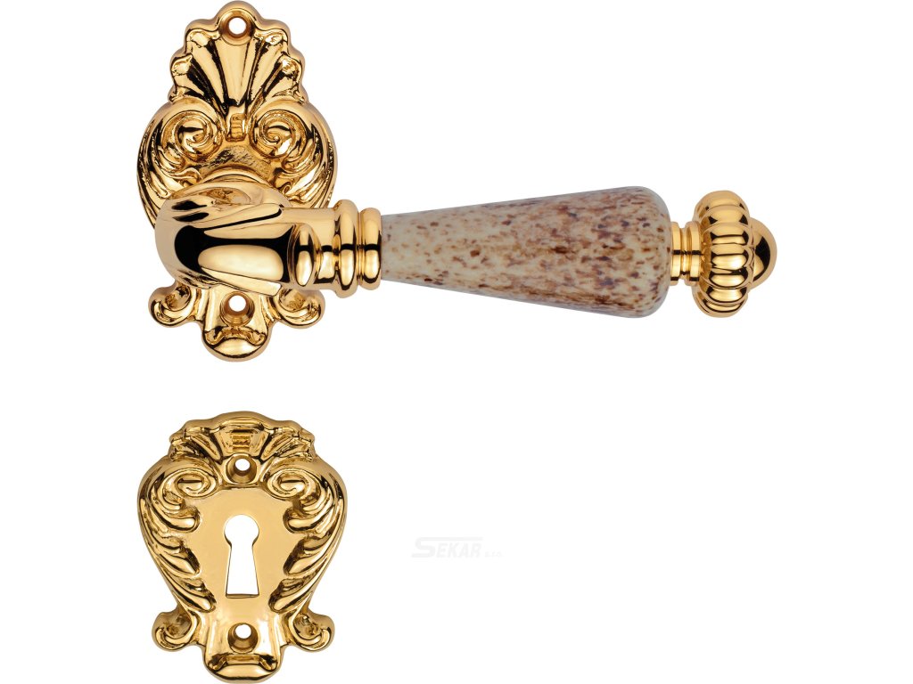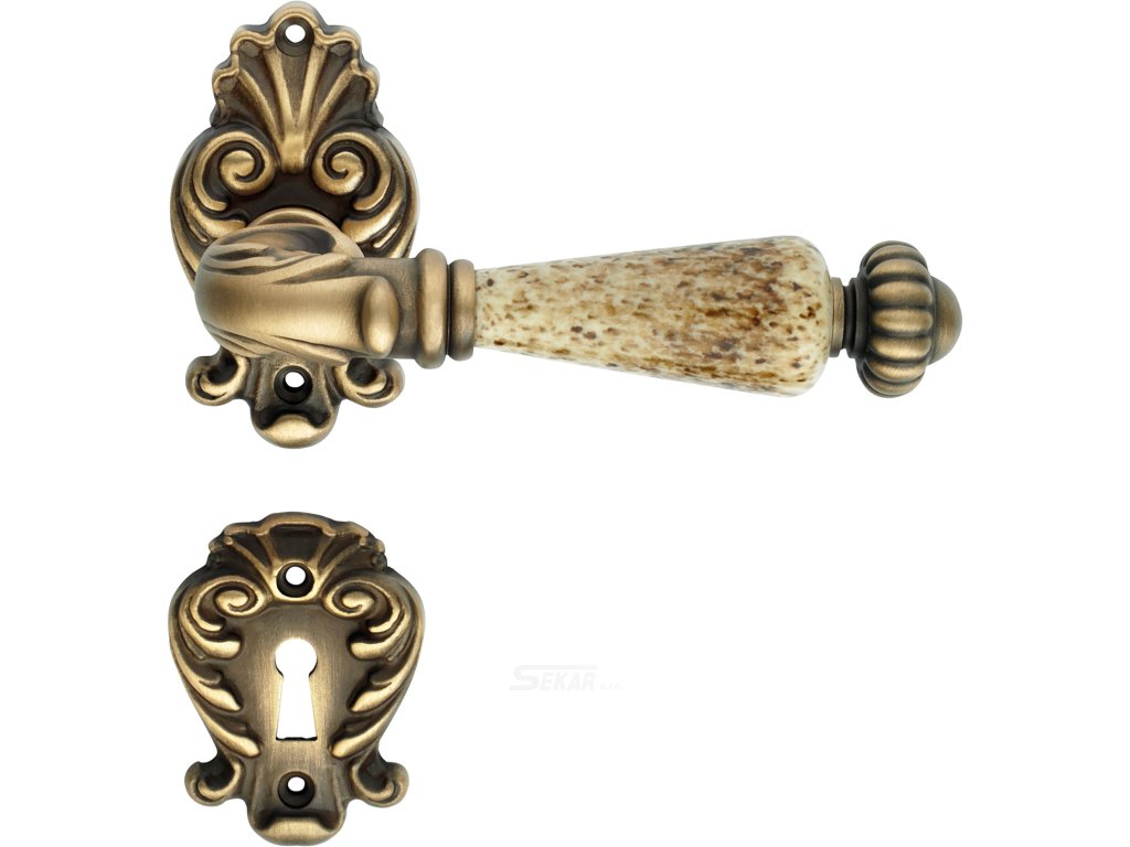 Mosazná stylová klika v galvanických povrchových úpravách. Velikost štítu 60x406mm.