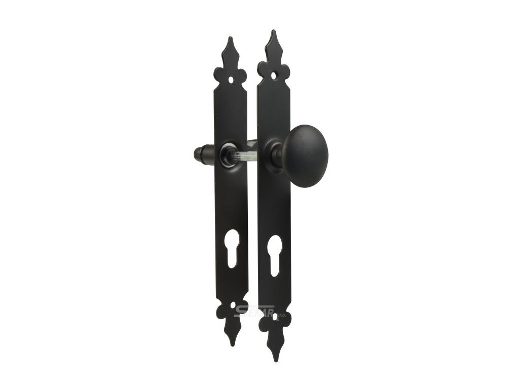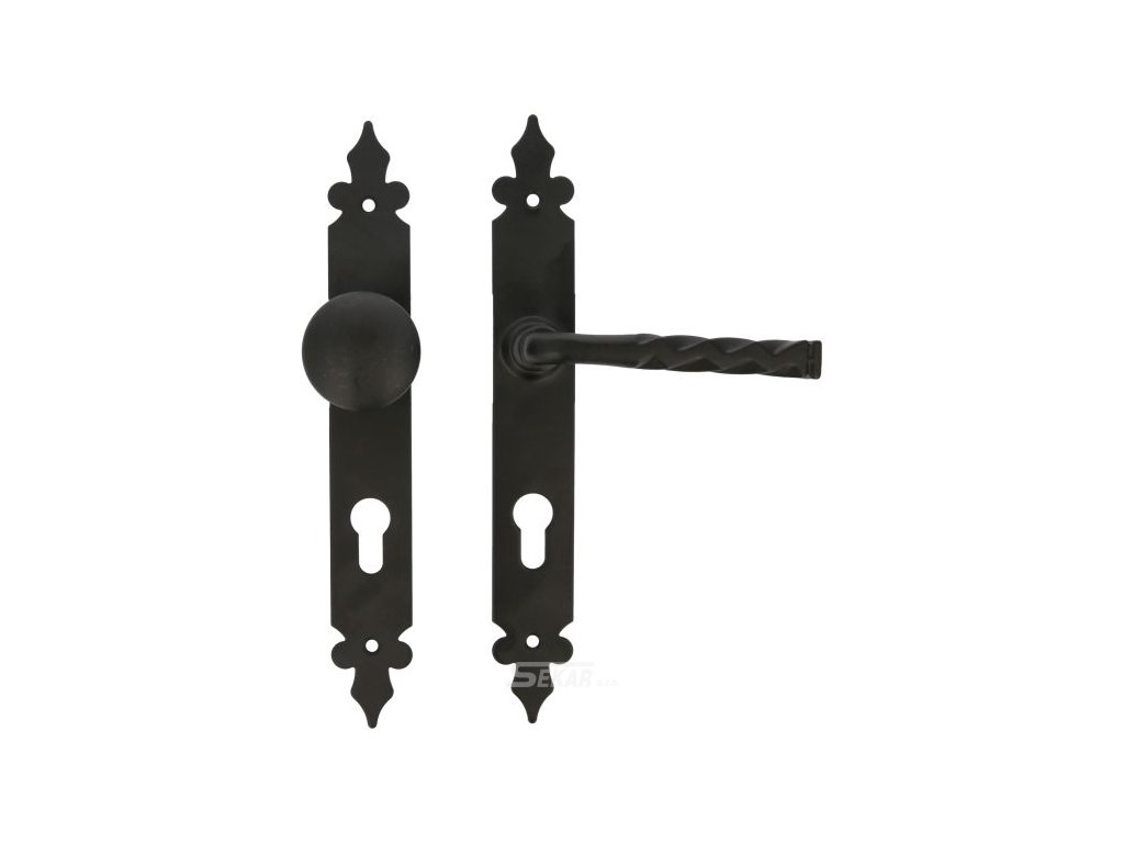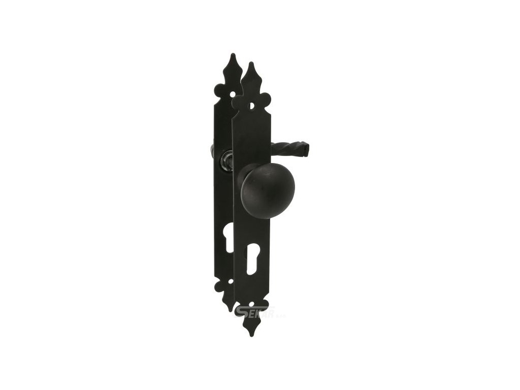 Retro klika. Štítek je železný a klika je vyrobena ze slitiny kovů s povrchovou úpravou natná černá.