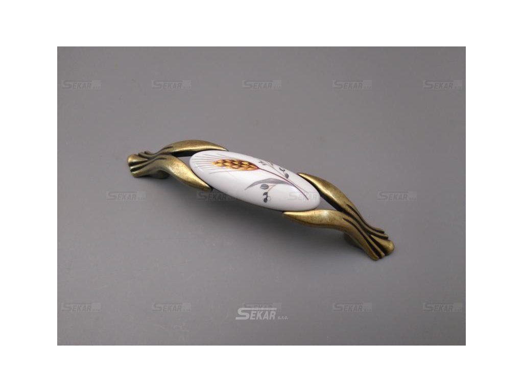 Nábytková úchytka pomosazená s patinou s porcelánem a dekorací. Úchytky se vyrábí zakázkovým způsobem a jejich výroba trvá přibližně 1 týden. Stejné dekorace jako jsou použité na úchytce je možné volit i na dalších výrobcích z porcelánu nabízených na tomto webu.