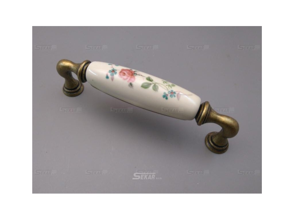 Pomosazená úchytka s porcelánem a dekorací, rozteč 128mm, porcelán světle krémový, vyráběná na zakázku.