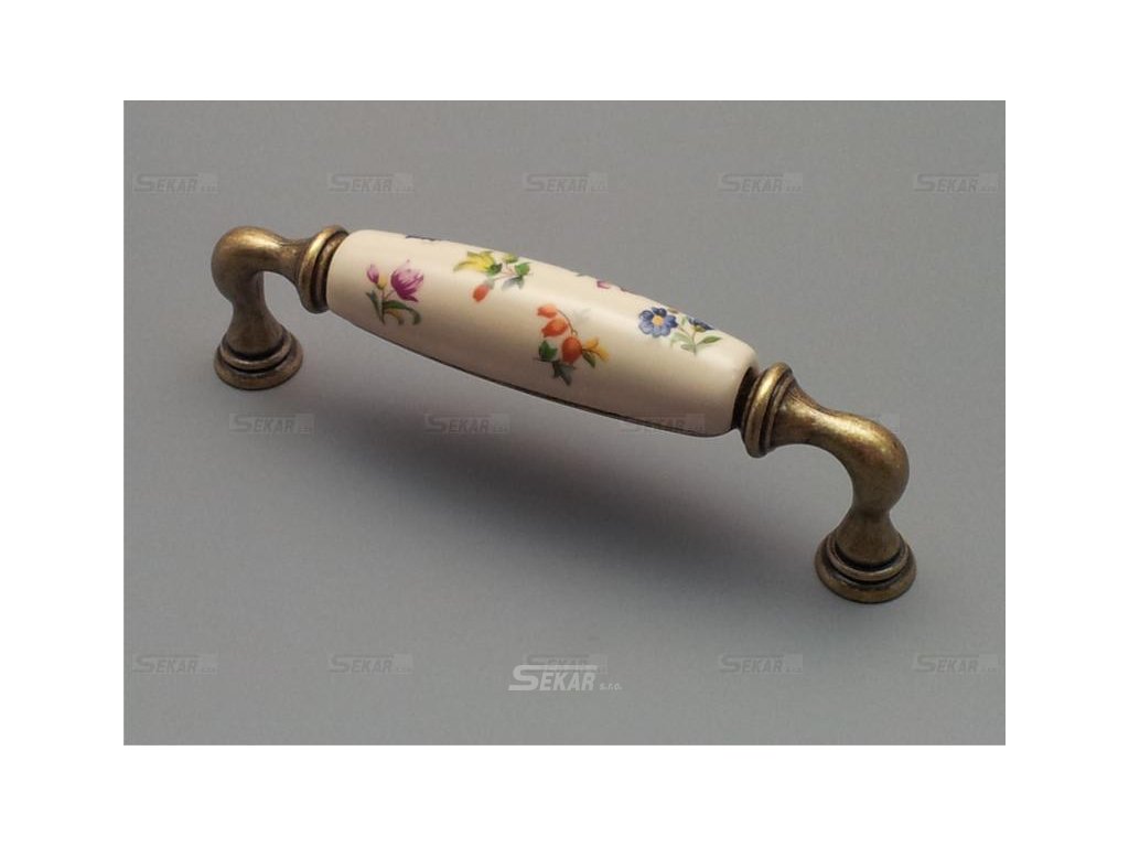 Pomosazená úchytka s porcelánem a dekorací, rozteč 128mm, porcelán tmavě krémový, vyráběná na zakázku.