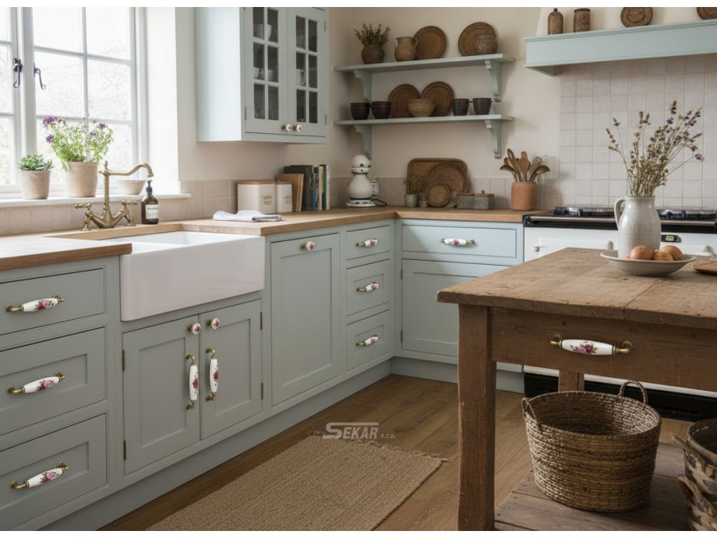 Dekorace porcelánu použitá na úchytce může být i na klikách, vypínačích, svítidlech, umyvadlech a obkladech.Doplňkové parametry