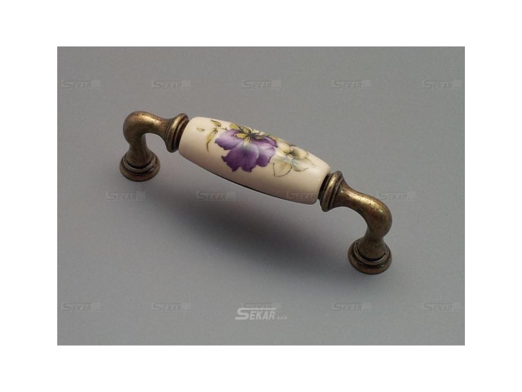 Pomosazená úchytka s porcelánem a dekorací, rozteč 96mm, porcelán tmavě krémový, vyráběná na zakázku.