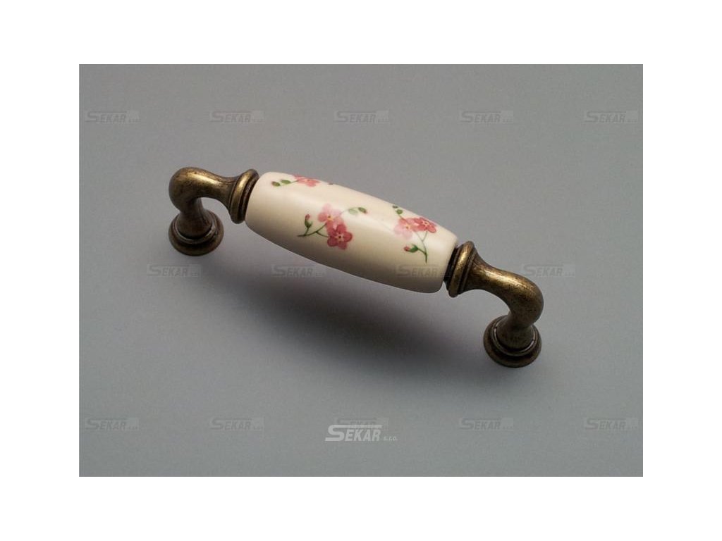 Pomosazená úchytka s porcelánem a dekorací, rozteč 96mm, porcelán tmavě krémový, vyráběná na zakázku.