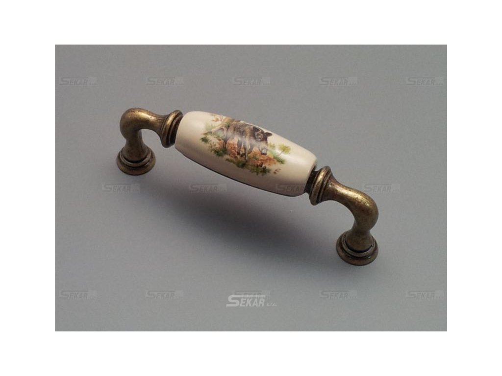 Pomosazená úchytka s porcelánem a dekorací, rozteč 96mm, porcelán tmavě krémový, vyráběná na zakázku.
